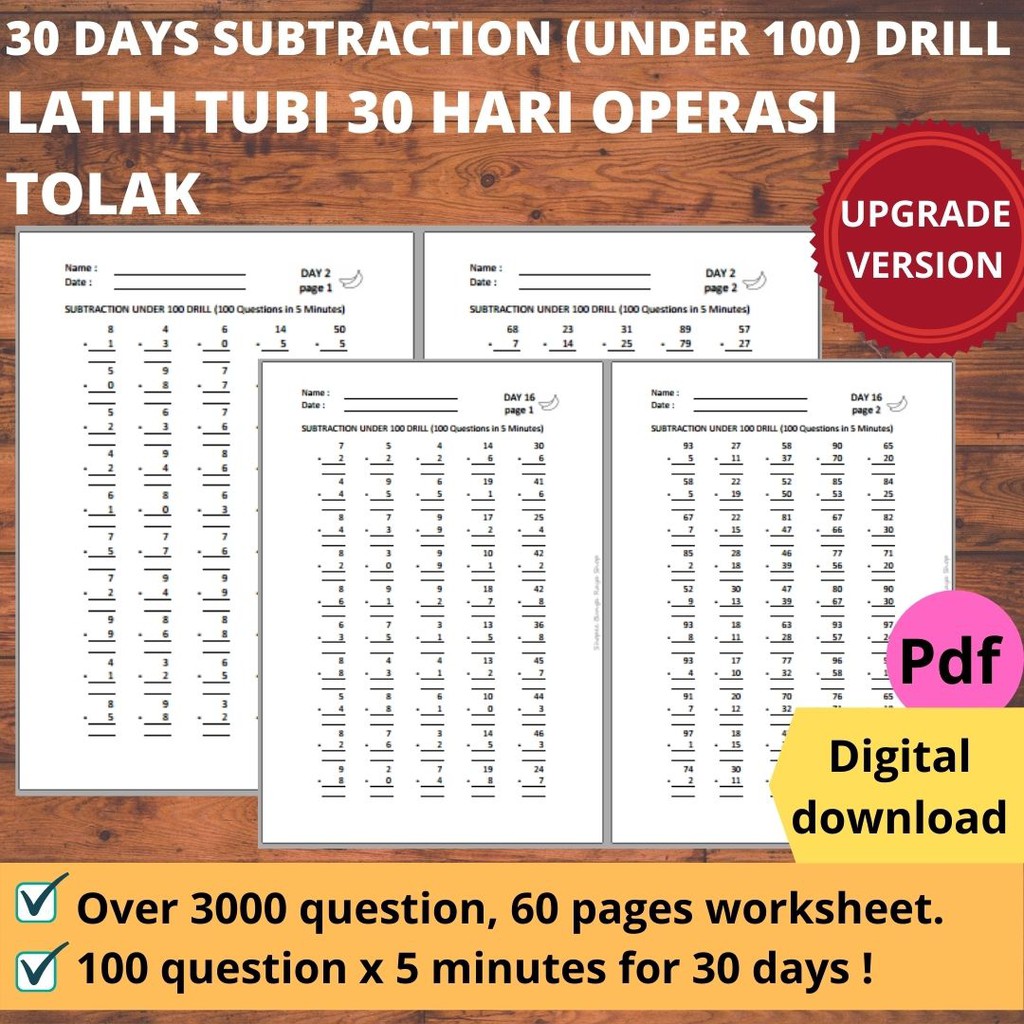 ✓ jawapan disediakan berbentuk pdf. ✓ mengandungi 64 muka surat. Latih tubi asas matematik tahun 6 kuiz. Printable math workbook buku matematik latih tubi 30 hari operasi tambah tolak drill worksheet kindergarten tadika pdf file kindergarten addition and .